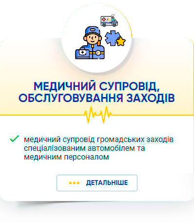 Ми пропонуємо супровід чергової медичної бригади на сучасному реанімобілі. Масові заходи характеризуються загрозою виникнення екстрених ситуацій, що потребують невідкладної медичної допомоги.